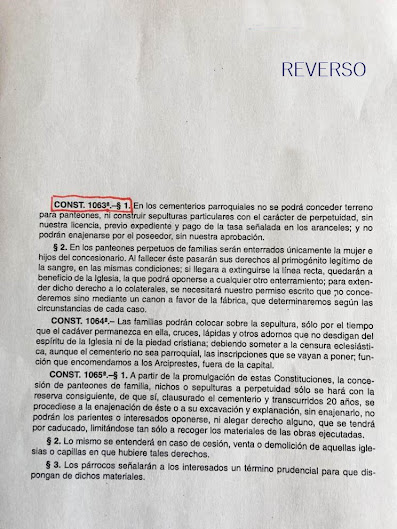 REVERSO: Síntesis de las Constituciones Sinodales (normativa) que le son de aplicación en todos los cementerios de la diócesis de Oviedo. Obsérvese especialmente la 1063-1 y 2 que regula y condiciona la concesión y transmisión del "Derecho de Uso" de panteones, sepulturas y nichos.